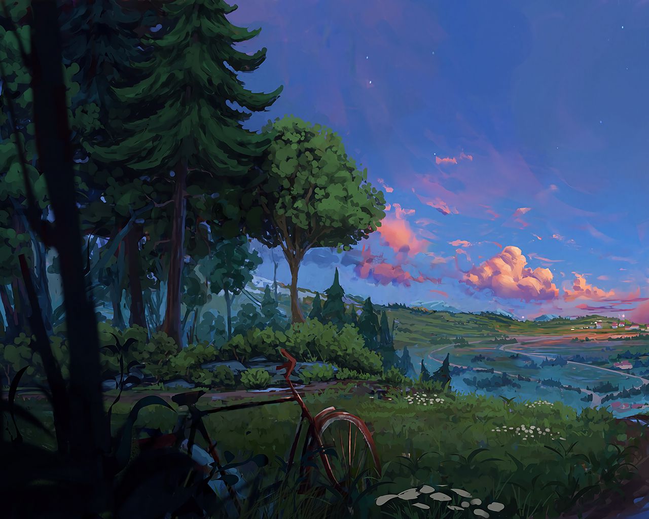 1280x1024 велосипед, деревья, арт, лес, пейзаж, лето обои стандарт 5:4