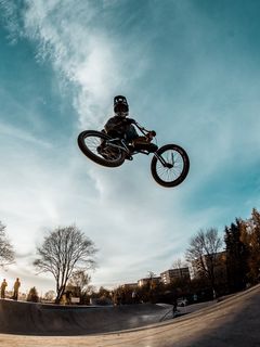 240x320 велосипедист, трюк, велосипед, шлем, небо обои мобильный телефон, смартфон