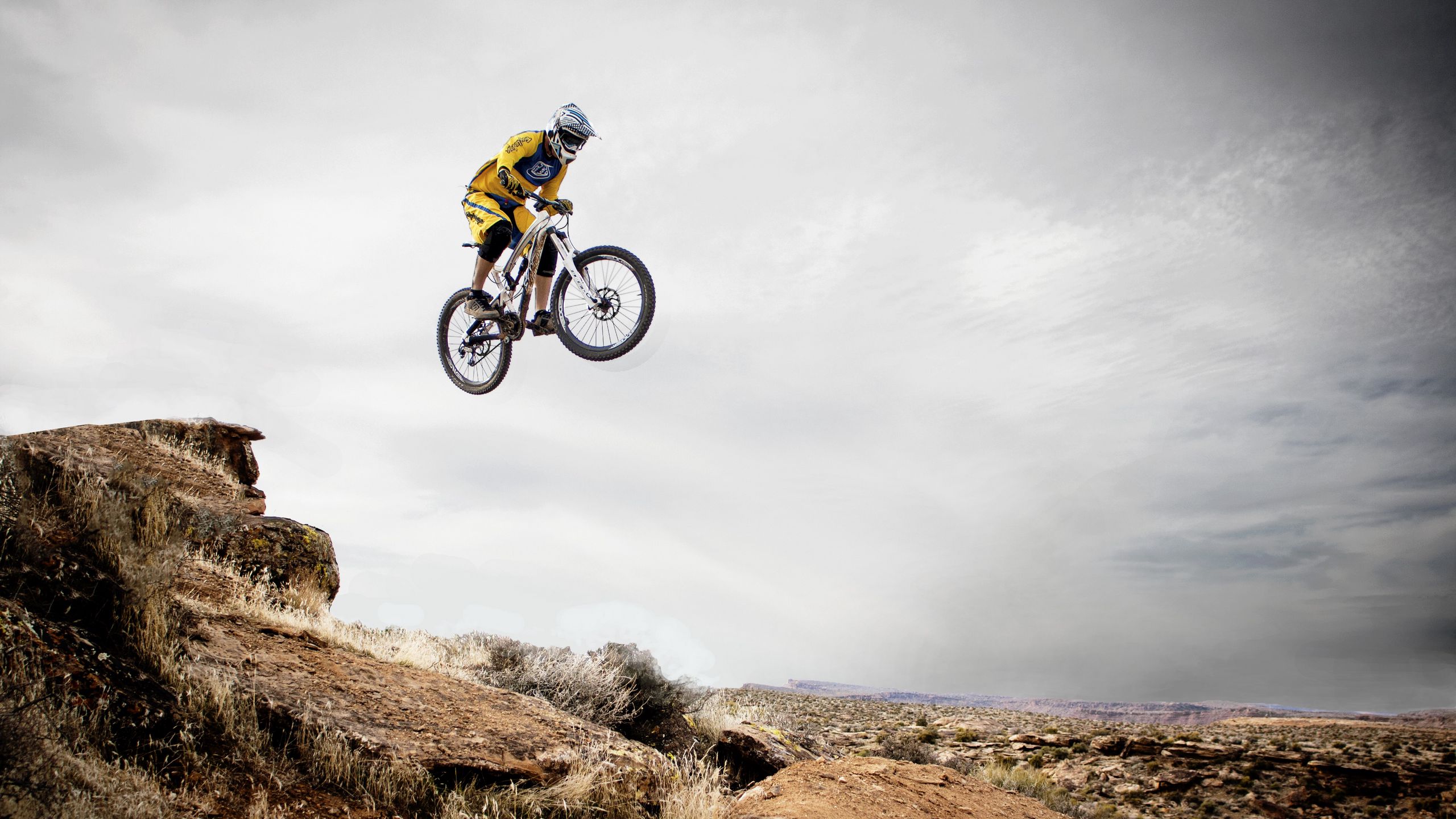 2560x1440 велосипедист, велоспорт, трюк, прыжок обои 16:9