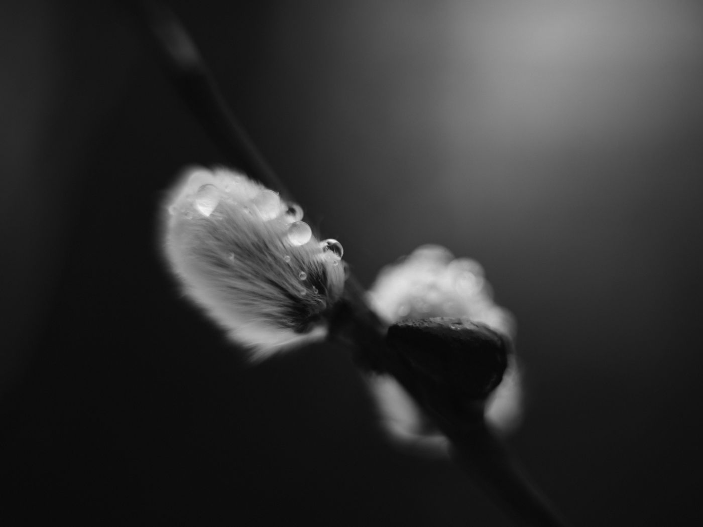 1400x1050 верба, почка, пух, капли, макро, черно-белый обои стандарт 4:3