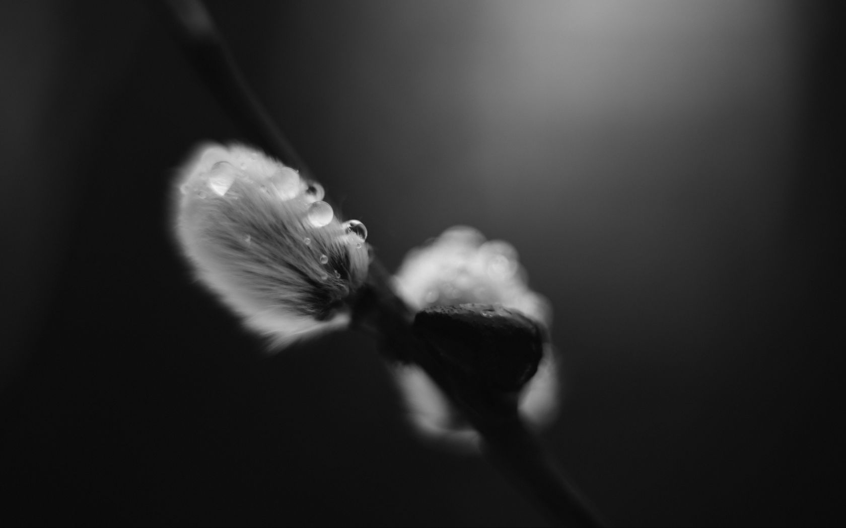 1680x1050 верба, почка, пух, капли, макро, черно-белый обои 16:10