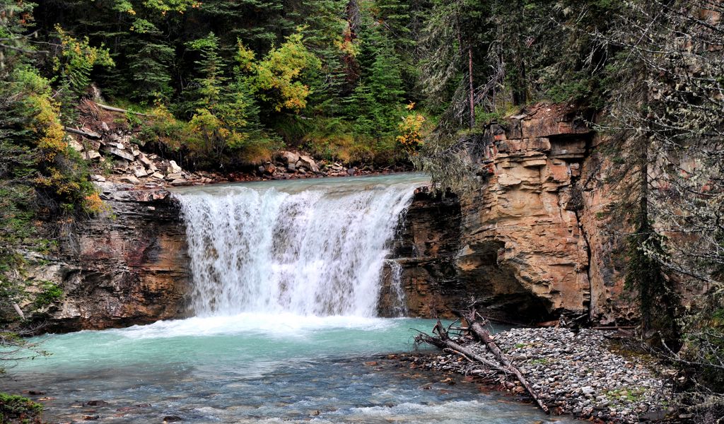 1024x600 водопад, поток, кусты, скалы, деревья обои нетбук, планшет