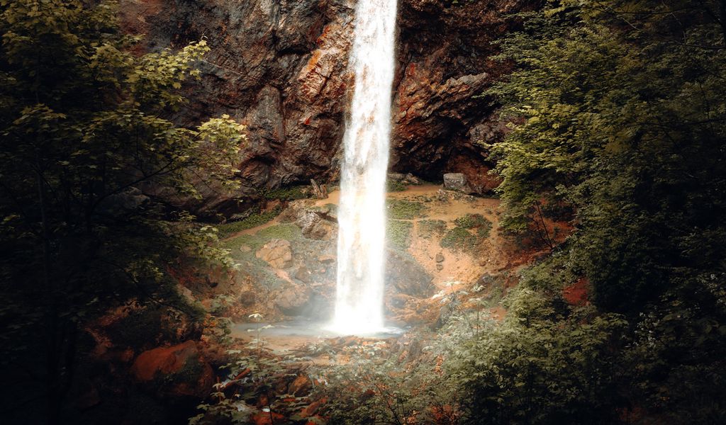 1024x600 водопад, поток, скалы, каменный, темный обои нетбук, планшет